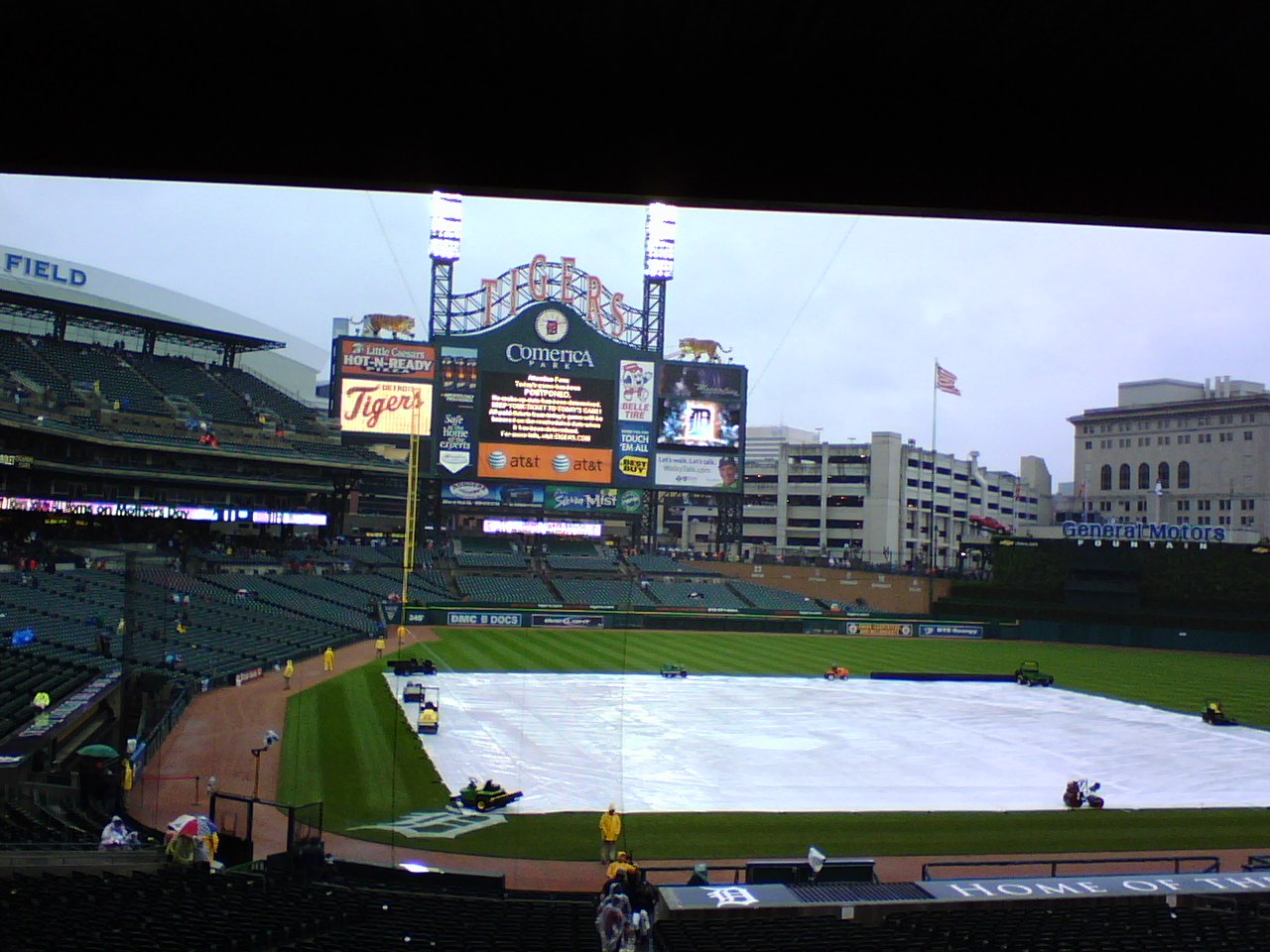 As the rain continues to fall, heavily at times, here in Detroit, I began thinking about two games that I attended this year that featured rain. I took my step-son to the Mother’s Day game between the Tigers and the Yankees on May 11th. He’s 15. His mom and I divorced 8 years ago and I’m very fortunate to still have him in my life. My ex-wife’s family is from New York and I thought Andrew might enjoy seeing a Yankees game. The last ball game we attended together was back in 1998 at Tiger Stadium. He had not yet been to Comerica Park.