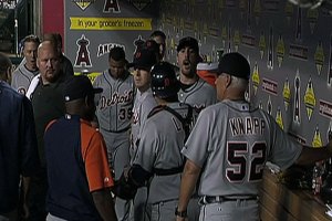 Despite the win, it seemed as though most people wanted to talk about a small exchange between Verlander and catcher Gerald Laird. I’m not sure what it was about. Apparently ESPN made more of an issue of it than FSTigers. I left the room for a moment while Verlander was pulled from the game. While he was in the dugout, he and Laird exchanged words.